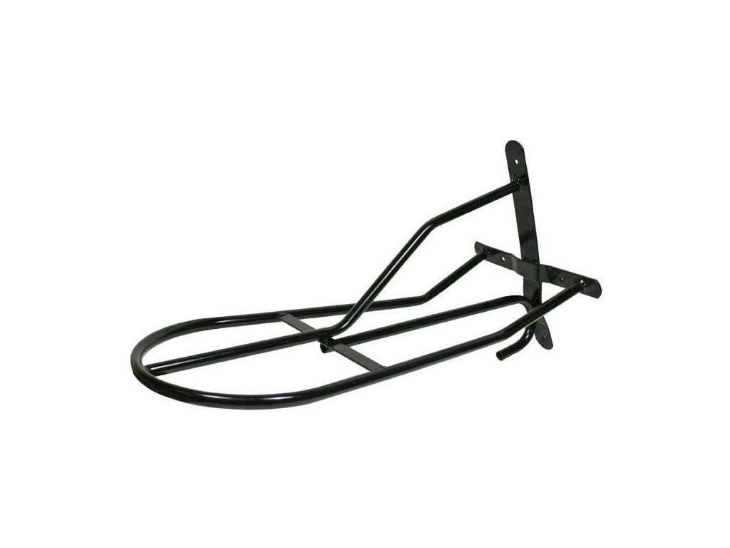 Tento čierny kovový držiak na sedlo spája odolnosť a elegantný dizajn. Vďaka sklopnej konštrukcii je ideálny pre malé priestory, kde je potrebné ušetriť miesto. Je vyrobený z kvalitného kovu s čiernou povrchovou úpravou, ktorá zvyšuje jeho odolnosť voči poškodeniu a korózii.