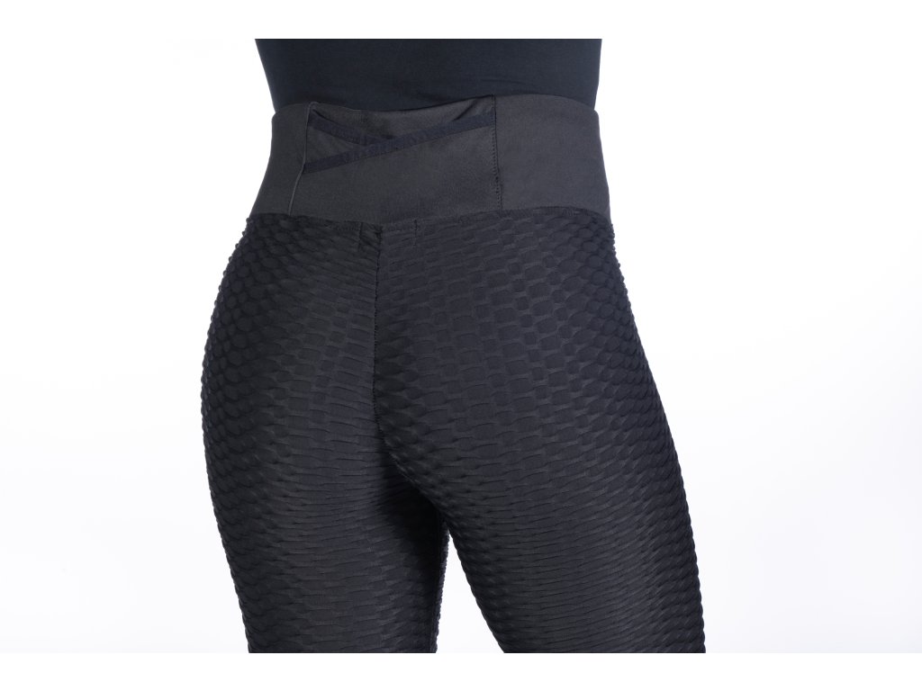 Vysoký pás s integrovaným zadným vreckom na mobil zaručuje funkčnosť a moderný vzhľad. 3D štruktúra materiálu podporuje krvný obeh, čím prispieva k väčšiemu pohodliu pri dlhšom nosení a tréningu.