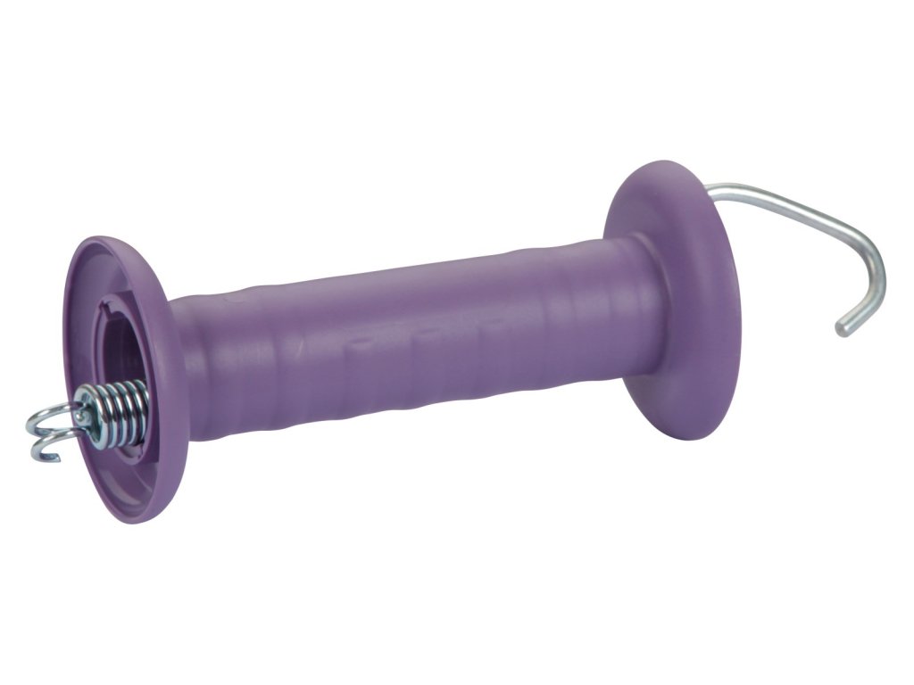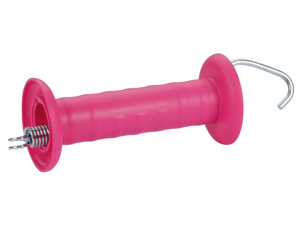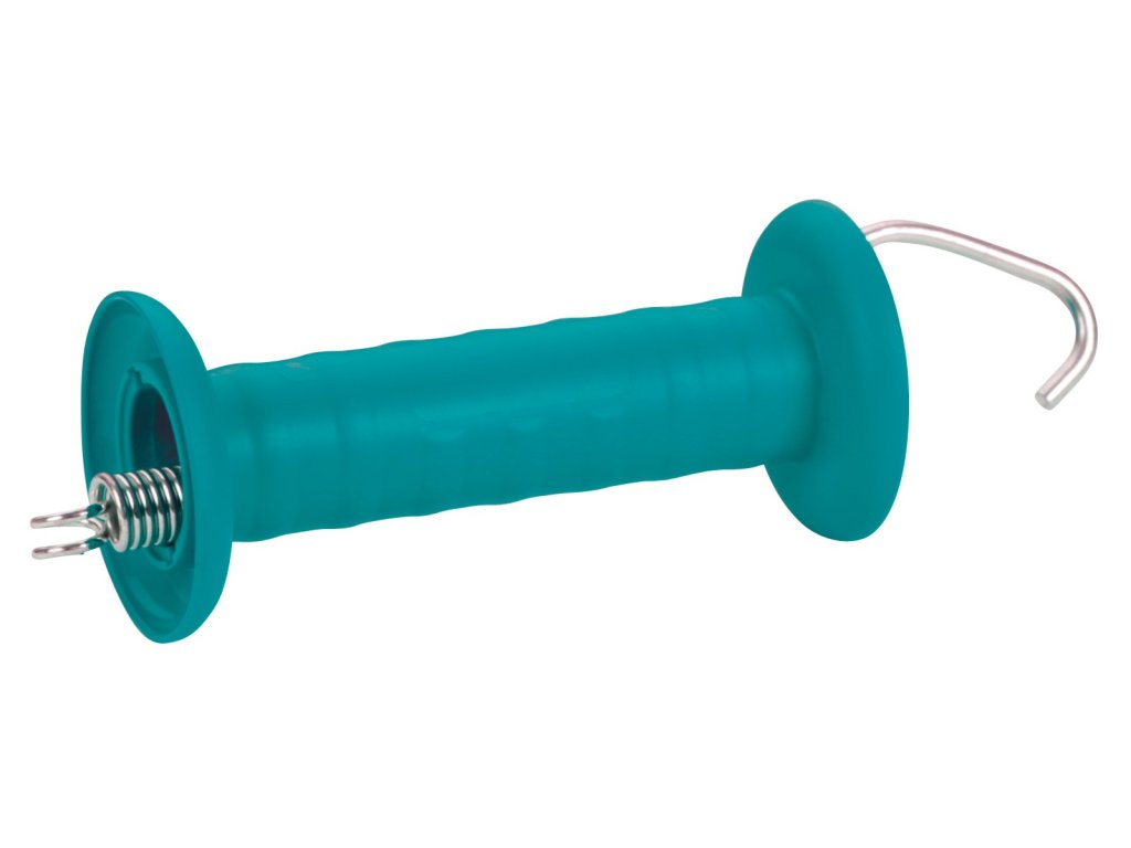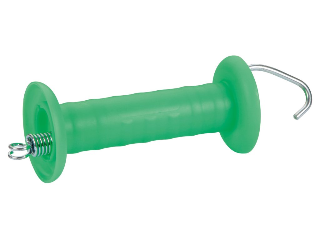 Spoľahlivá rúčka na bránku pre elektrický ohradník s pozinkovaným hákom a pružinou. UV-stabilizovaný plast a jednoduchá napínacia pružina pre bezpečné používanie.