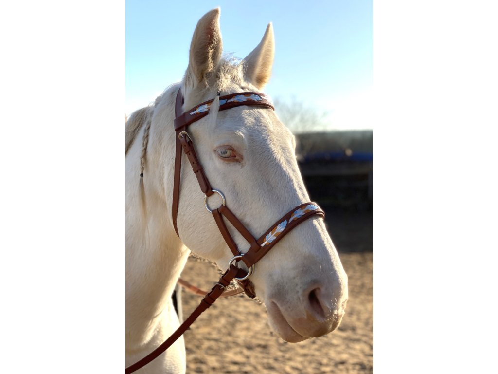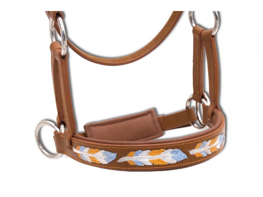 Anatomicky tvarovaný nátylník podporuje správne rozloženie tlaku a poskytuje voľnosť uší, čo ocenia najmä citlivejšie kone. Nánosník a čelenka sú bohato zdobené ručne maľovaným pierkovým motívom, ktorý dodáva sidepullu originálny westernový charakter.