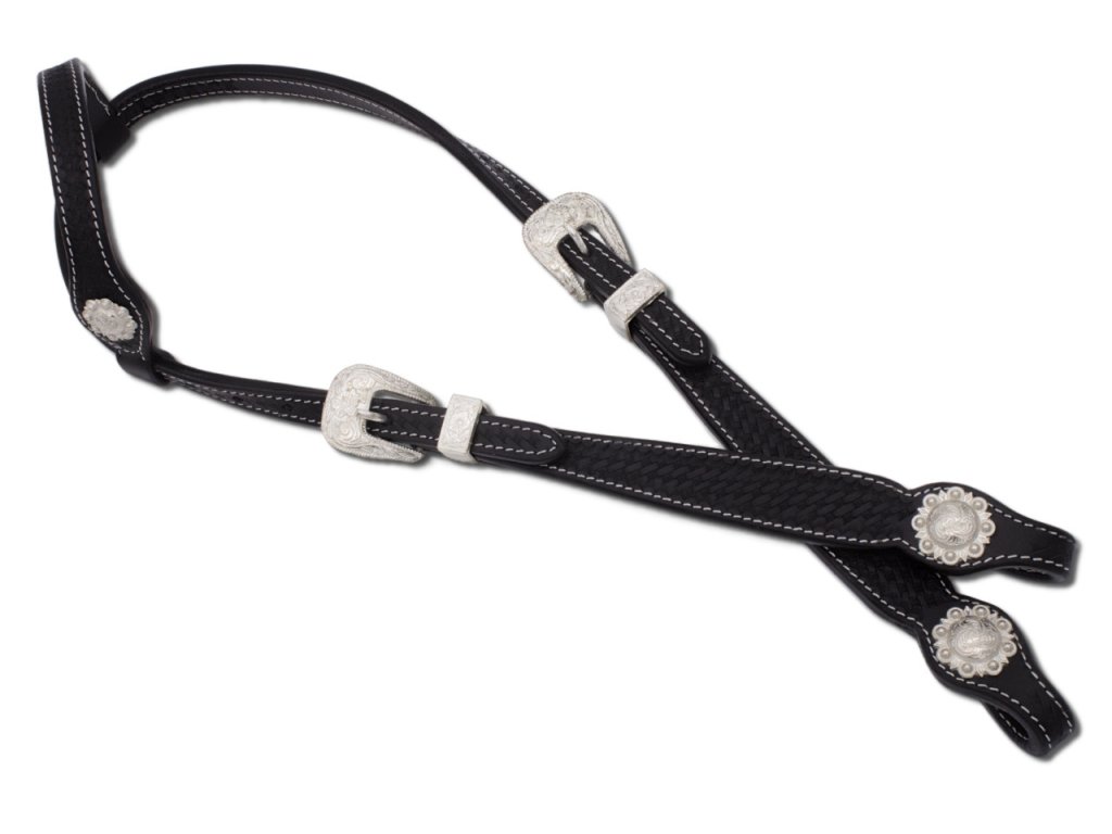 Uzdička je vyrobená z kvalitnej čiernej kože s tradičnou košíkovou razbou, ktorá dodáva uzdičke autentický westernový charakter. Dizajn dopĺňajú strieborné pracky, ktoré vytvárajú elegantný kontrast k čiernej koži.