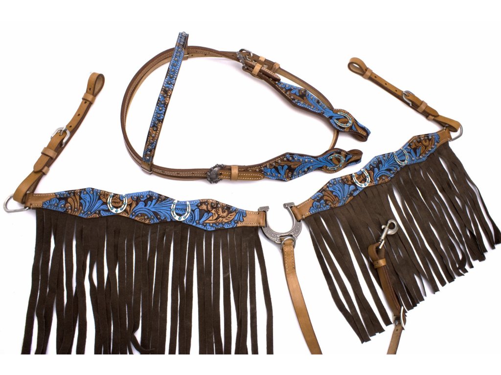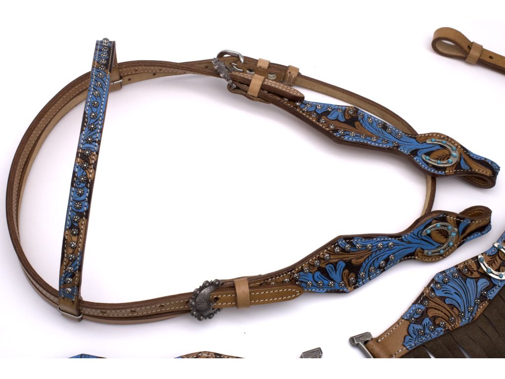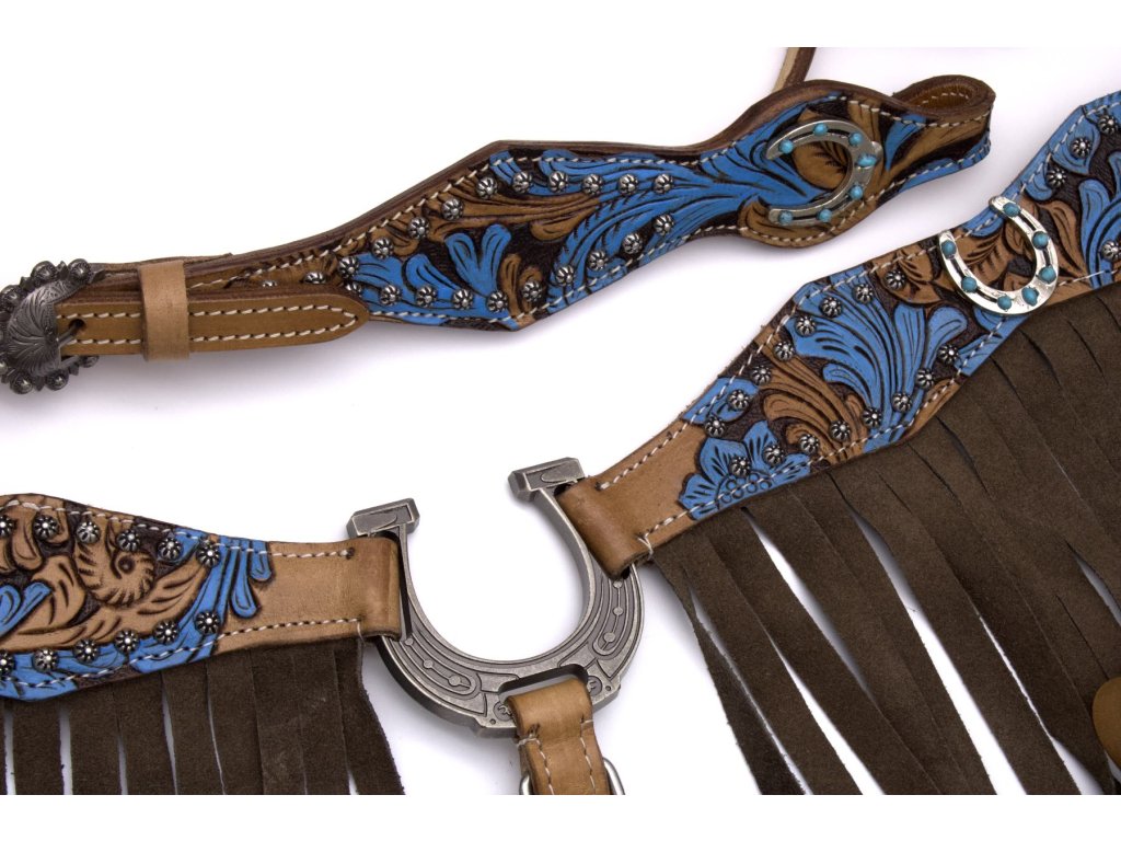 Westernový show set „Turquoise Horseshoe Detail“ je ideálnou voľbou pre jazdcov, ktorí milujú precízne detaily, výrazné farby a autentický westernový dizajn. Set zaujme na prvý pohľad svojím bohatým ručným maľovaním v tyrkysových odtieňoch, ktoré dodáva výstroju jedinečný a luxusný vzhľad.